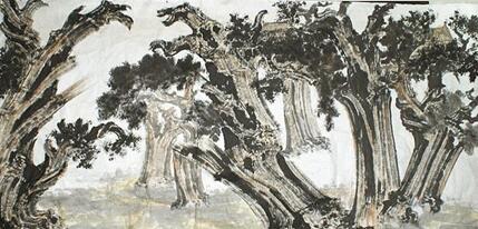 另一個(gè)他擅長(zhǎng)的題材是古柏樹(shù)。1992年他去泰山采風(fēng)途中。山上的古柏樹(shù)生機(jī)勃發(fā),堅(jiān)韌不拔,給他帶來(lái)了一種震撼的力量。他當(dāng)時(shí)就想將這些古柏入畫(huà),為古柏注入精神意義。從此,在孔府、孔林、古蜀道以及陜西等地都留下他觀察古柏的足跡。有評(píng)論家認(rèn)為,他的藝術(shù)作品不但在整體的構(gòu)圖上自然、清新和潤(rùn)朗。而且在整體的布局上,疏密相間,虛實(shí)相融,用獨(dú)有藝術(shù)感覺(jué)構(gòu)建出了一個(gè)既蘊(yùn)含了詩(shī)情畫(huà)意,又張揚(yáng)了文化魅力和內(nèi)心情感的藝術(shù)空間。