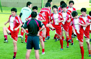 昨天傍晚5時30分開始的近兩個小時的訓(xùn)練中,朱廣滬拿出40分鐘的時間專門演練前場定位球。由于孫祥感冒沒有參加昨天的訓(xùn)練,罰角球的任務(wù)給了腳法秀麗的陳濤和鄭斌。